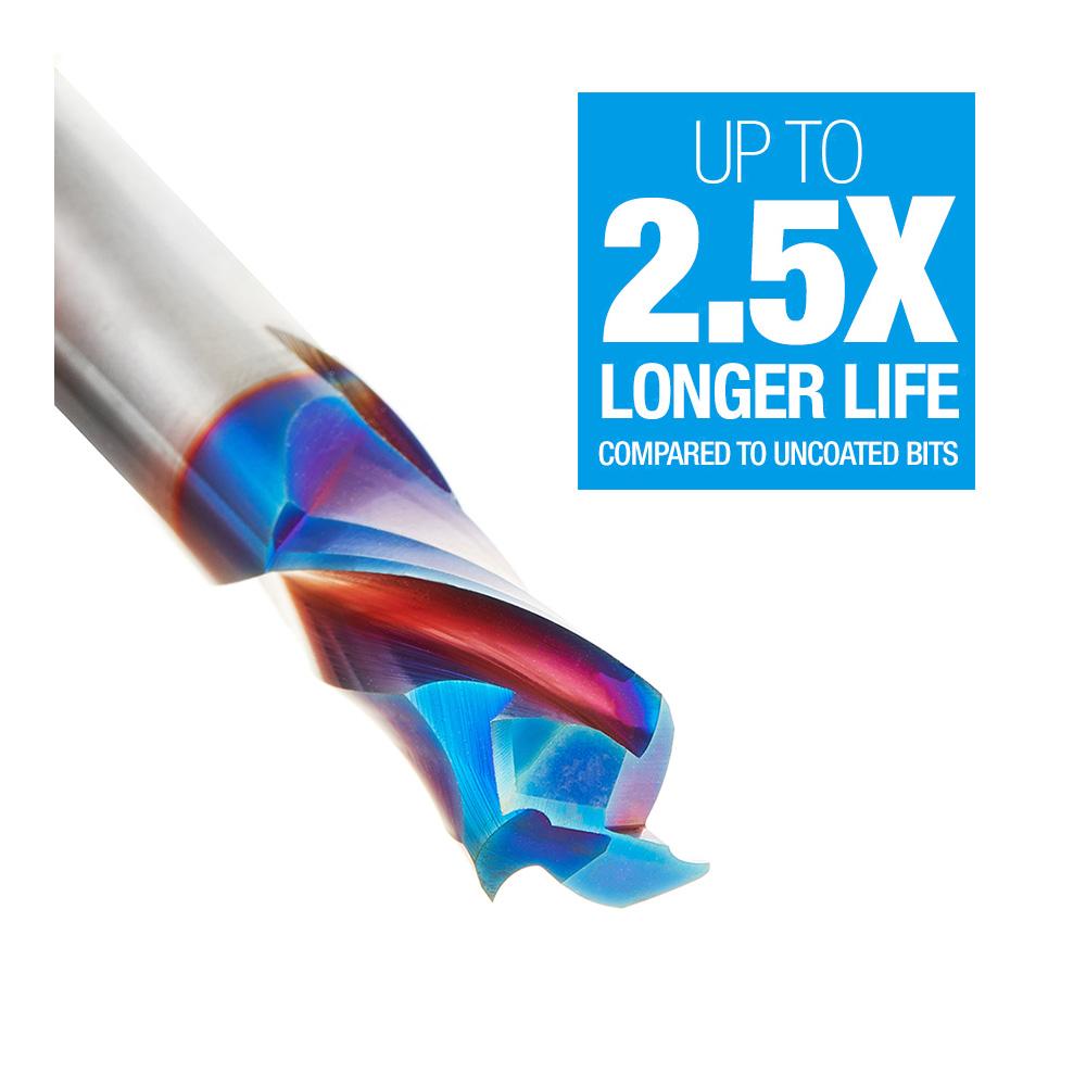 Our Spektra™ bits feature a nACo® nanocomposite coating with an extreme nanohardness and heat resistance. With a brilliant distinctively-tinted coloring nACo provides additional improvements in four critical aspects of router tooling.