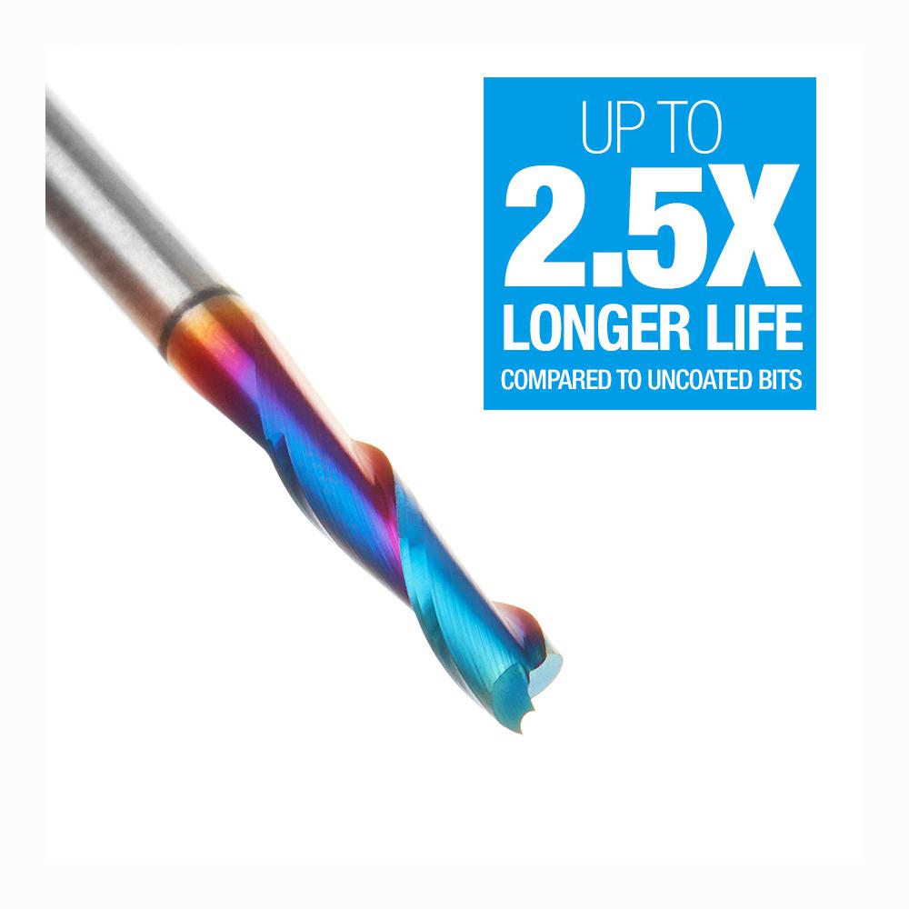 Our Spektra™ bits feature a nACo® nanocomposite coating with an extreme nanohardness and heat resistance. With a brilliant distinctively-tinted coloring nACo provides additional improvements in four critical aspects of router tooling.