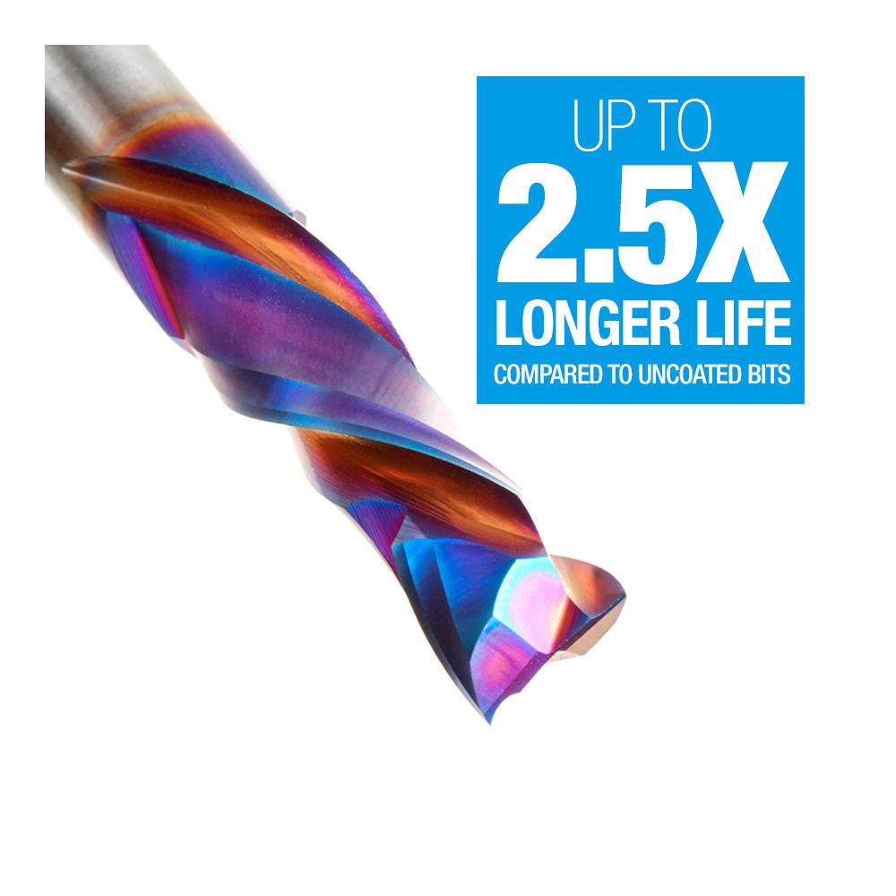 Our Spektra™ bits feature a nACo® nanocomposite coating with an extreme nanohardness and heat resistance. With a brilliant distinctively-tinted coloring nACo provides additional improvements in four critical aspects of router tooling.