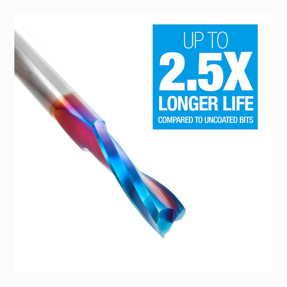 Our Spektra™ bits feature a nACo® nanocomposite coating with an extreme nanohardness and heat resistance. With a brilliant distinctively-tinted coloring nACo provides additional improvements in four critical aspects of router tooling.