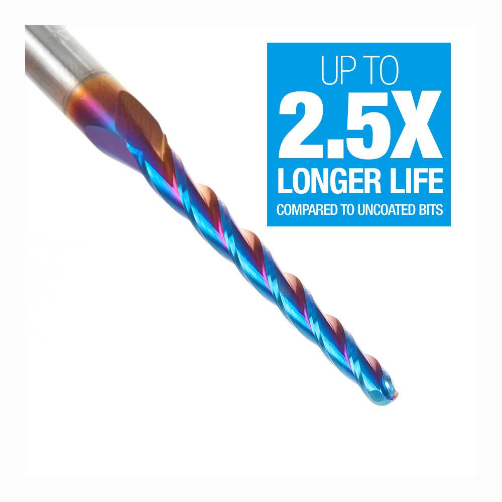CNC 2D and 3D Carving 1 Deg Tapered Angle Ball Tip x 1/8 Diameter x 1/16 Radius x 1-1/2 x 1/4 Shank x 3 Inch Long x 3 Flute Solid Carbide Up-Cut Spiral Spektra™ Extreme Tool Life Coated Router Bit