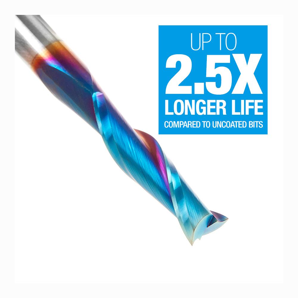 Our Spektra™ bits feature a nACo® nanocomposite coating with an extreme nanohardness and heat resistance. With a brilliant distinctively-tinted coloring nACo provides additional improvements in four critical aspects of router tooling.