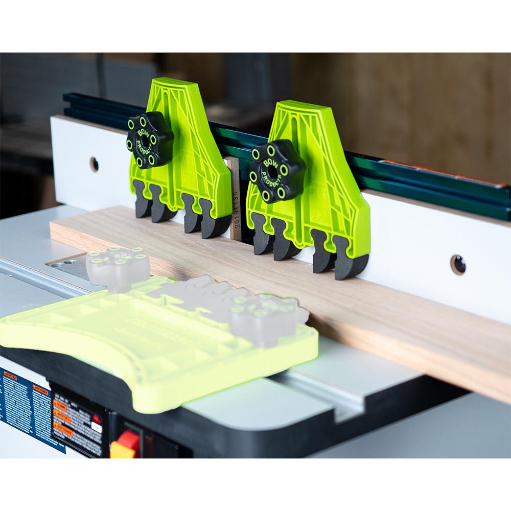FencePRO featherboard is designed for use to hold down material on all types of fences. FencePRO features the same EVA feather technology as the FeatherPRO/FeatherDUO, which has revolutionized featherboard performance and safety. With FencePRO, you apply firm downward pressure yet still maintain a smooth glide. The feathers apply greater surface contact area that dampen vibration without marring material for the cleanest possible cut. FencePRO protects you against kickback far better than plastic or wood feathers. EVA is a High-Density closed-cell material that is exceptionally durable and absorbs energy from kickback. Feathers are also shatterproof and unlike plastic feathers can be replaced if damaged. FencePRO offers benefits you simply cannot get with plastic or wooden feathers. Use FencePRO with our FeatherPRO featherboards for the ultimate in feed control and safety. FencePRO comes in a 2- pack for use separately or for stacking.