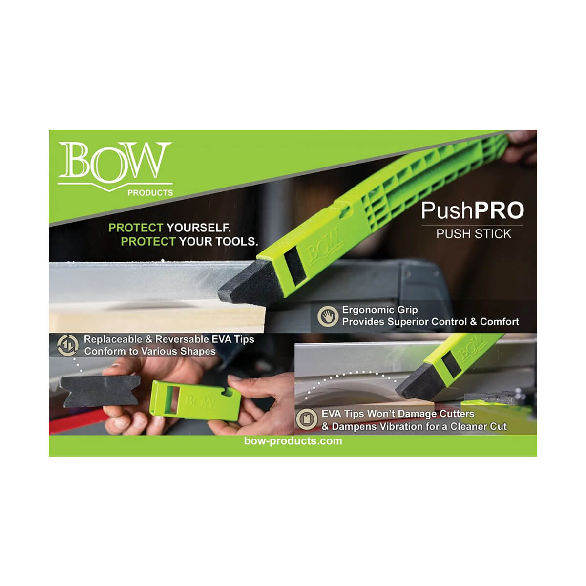 MINI PushPRO Push Stick offers unprecedented safety improvements and innovative new benefits in a tool category that has lacked innovation for years. Featuring High Density EVA tips, PushPRO improves feed control, protects wood, and protects you and your tools. PushPRO EVA tip is non-marring and dampens vibration for a cleaner cut versus plastic. Unlike plastic push sticks which can present a danger if it accidentally contacts a moving blade, PushPRO’s EVA tip will simply cut through the tip without a violent reaction. EVA tips are replaceable, reversible and will not set off a Saw Stop. EVA material is firm, durable and will not shed, bleed color, or absorb liquid. The MINI PushPRO Push Stick features our shorter handle and is 12.5″ long. If you want a different handle, no problem. PushPRO’ modular design lets you adapt your own custom-made handle. The Performance, Versatility and Safety benefits of PushPRO is unmatched.