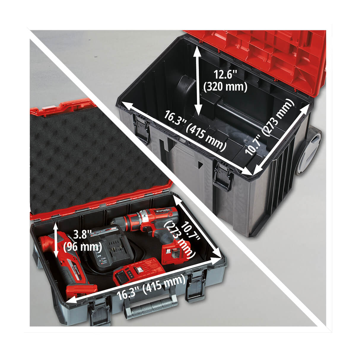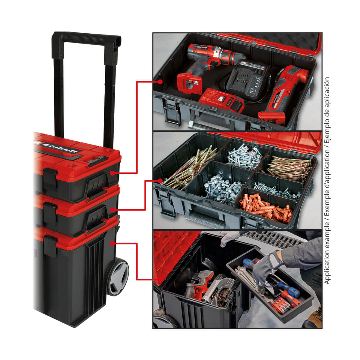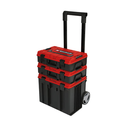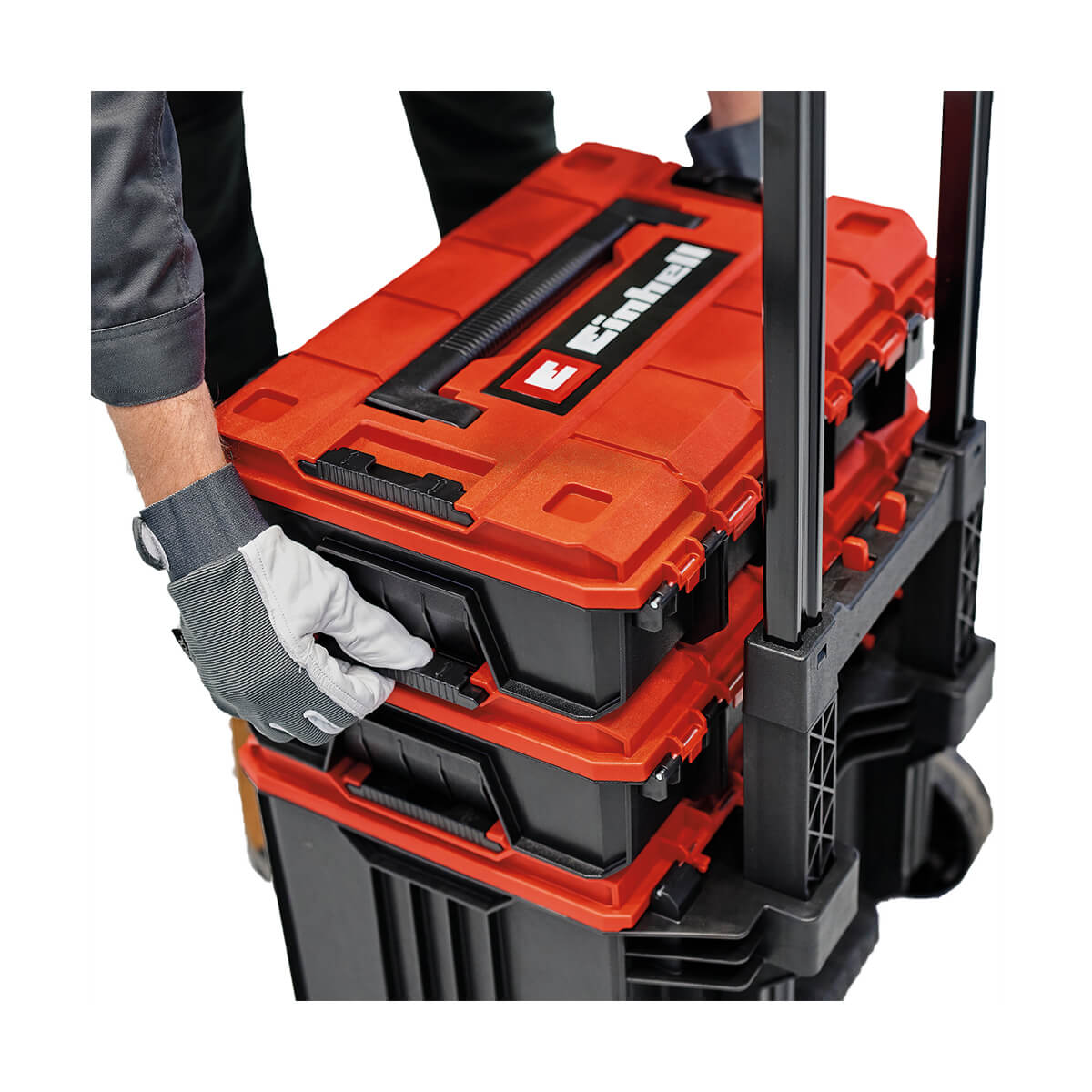 The Einhell E-Case Tower is a member of the modular E-Case system from Einhell. This stands out for the storage and transport of tools and accessory. A practical locking system for connecting stacked cases ensures systematic and safe order during transport. The case is made of polypropylene and therefore it has high stiffness, heat resistance and impact resistance. The stable construction allows a total payload of up to 120 kg (264.56 lbs.). Machines and tools can be transported easily thanks to the telescopic and extra-wide handle. The large wheels provide pleasant rolling characteristics on any surface. Thanks to its intelligent design, the case is splash-proof and can be transported in any weather. A retractable and ergonomic handle ensures optimal carrying comfort. The E-Case can be equipped with a padlock to be secured against theft. E-Case L contains 1x tray for hand tools. One E-Case S contains foam inlay for scratch-free transport, the other E-Case S contains compartments for tidy storage of accessory. In total 3x scribable stickers are included - to always know the contents.