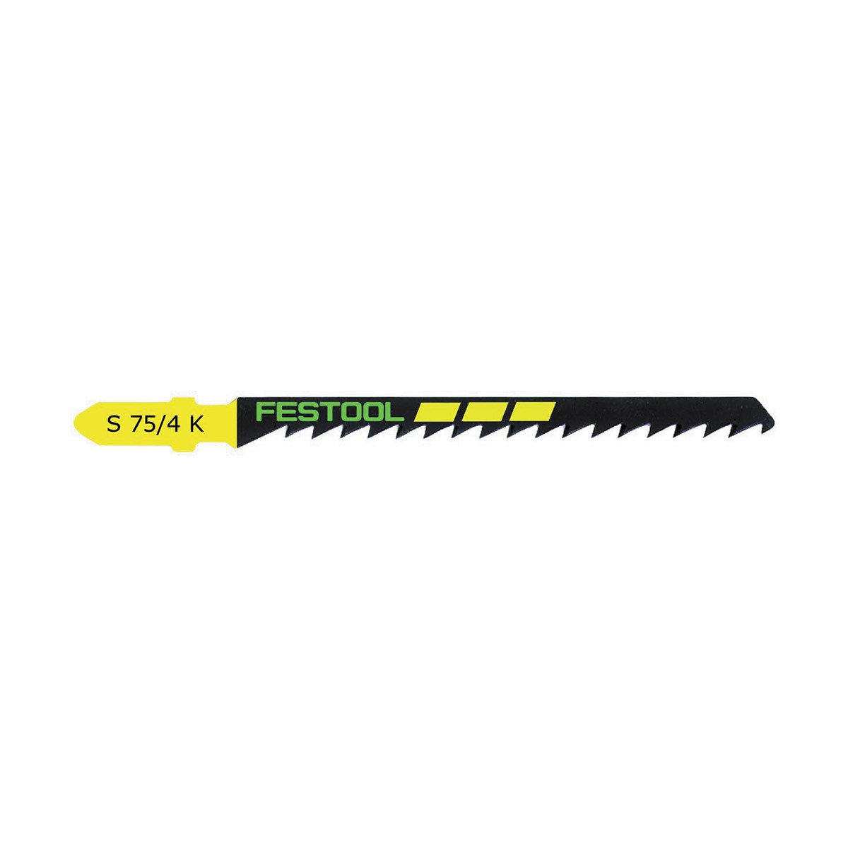 The S 75/4 K jigsaw blade is the ideal blade for scroll cuts in a wide range of different materials. This is the right blade for tight curves. Very good results can be achieved in softwood, hardwood, melamine, veneered plywood, chipboard, soft plastics, ABS, HDPE, and similar materials. The cross-set teeth design is ideal for fast cuts. For delicate and fine scroll cuts the S 50/1.4 K blade (486564) is recommended instead. Festool jigsaw blades are engineered for cutting efficiency, long life, and superior cutting results, with a universal T-shank design that fits most professional jigsaws. Festool has the right blade for any application or type of material, ensuring precise and consistent results. In order to select the right jigsaw blade for your application, think first about the type of material you want to cut, since there are blades available for wood, plastics, non-ferrous metals, steel, and special materials like fiberglass, foam, and other materials. Next, decide what kind of cut you need: fine, fast, scroll, clean. This will help to decide which blade is right for you. All Festool jigsaw blades are from high-quality materials for the best possible cutting results. Pack of 5 jigsaw blades.