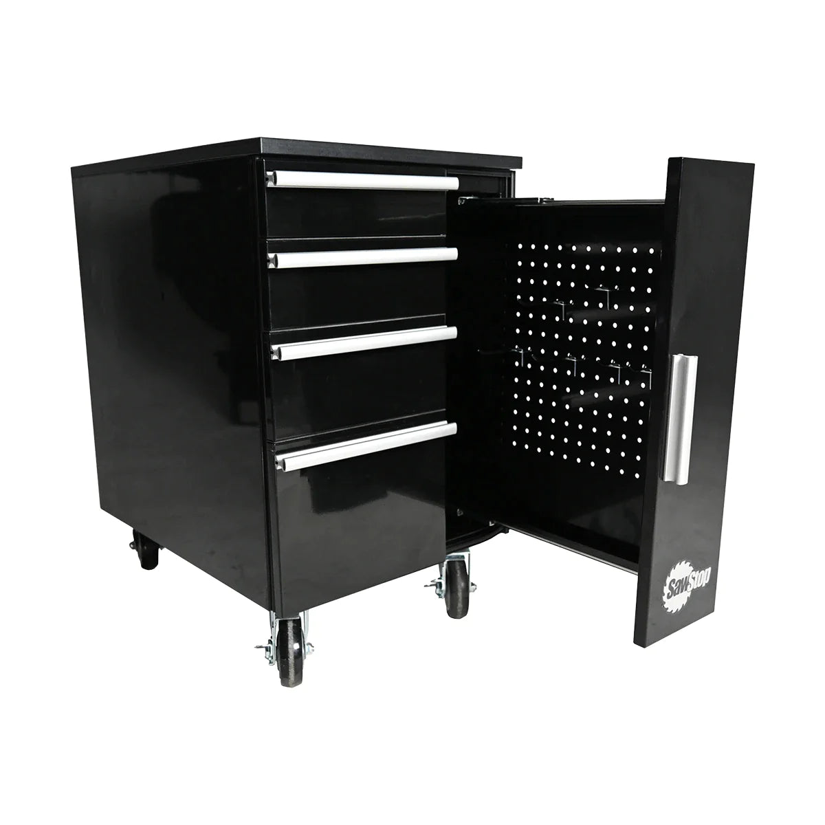 - 1 vertical pegboard and 4 horizontal fully-extendable drawers offer storage for a variety of tools and accessories.