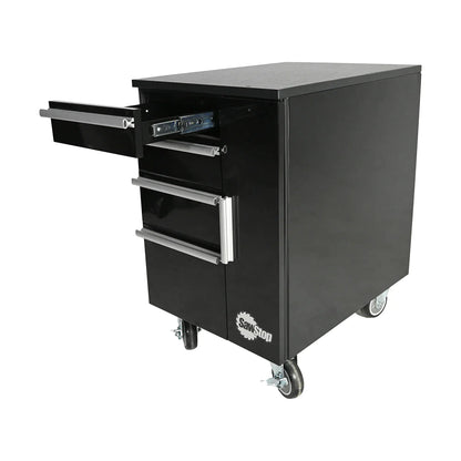 - Heavy-duty welded steel construction. 4 locking, swivel casters for easy mobility. Smooth, slow-close drawer slides 18" W x 25.25" D x 29" H