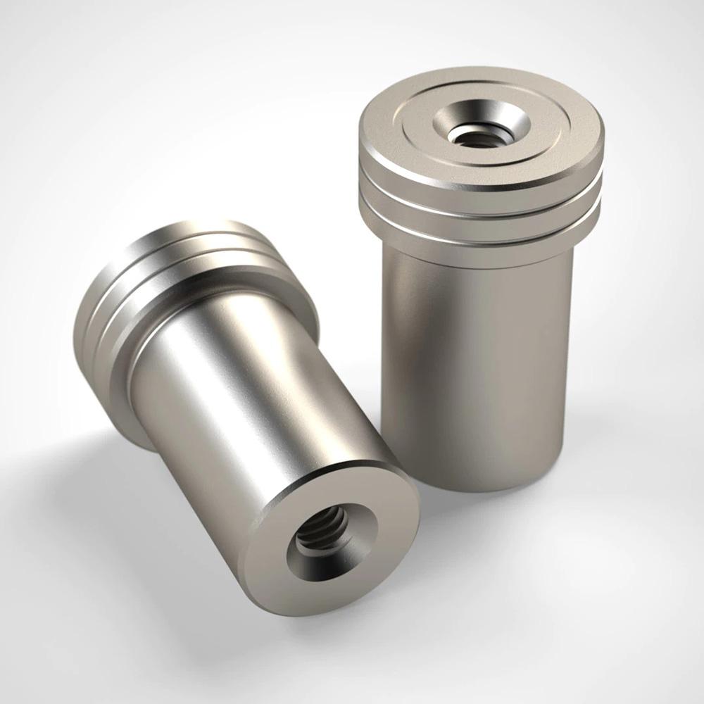 DoubleGroove CF-Dogs are distinguished by their slightly larger body diameter, 0.003" (0.08 mm) to be exact. While this change may seem minute, it makes all the difference in eliminating any unwanted play that may be present when a standard 20mm dog is inserted into a precision-cut 20mm hole. A CF-Dog can be easily identified by the addition of a single annular groove in its top surface.