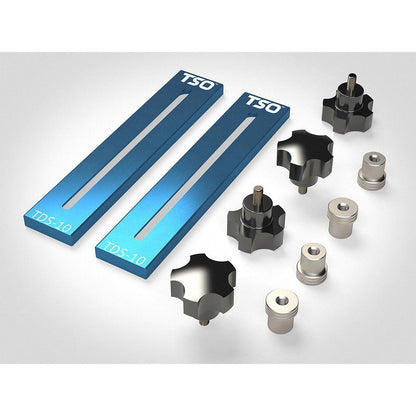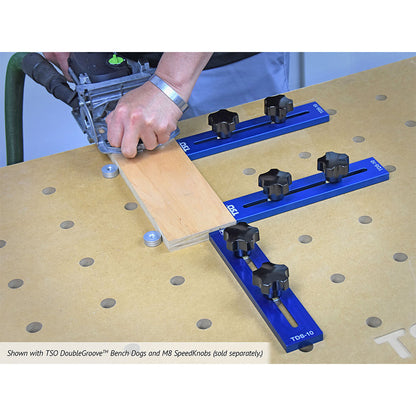 The TDS-10 are the first material stops designed specifically for 20mm hole-pattern worktops, offering infinitely and precisely repeatable position choices. Unlike conventional bench dogs, the TDS-10 Dog Stops™ are fully adjustable over (3) three 20mm holes on 96mm centers, yet they remain as solid as a rock when locked in place on the table.