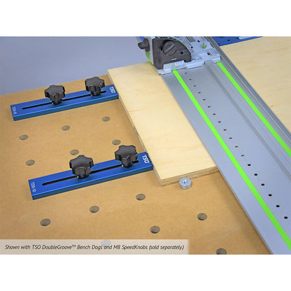 When you have a different length to cut, TSO Dog Stops™ pop right out of their 20mm holes without loosening the knobs and will remain ready to duplicate your original cut length in an instant. Just drop the TDS-10 Dog Stops back in their original two dog holes and your length of cut will be identical to the previous pieces.