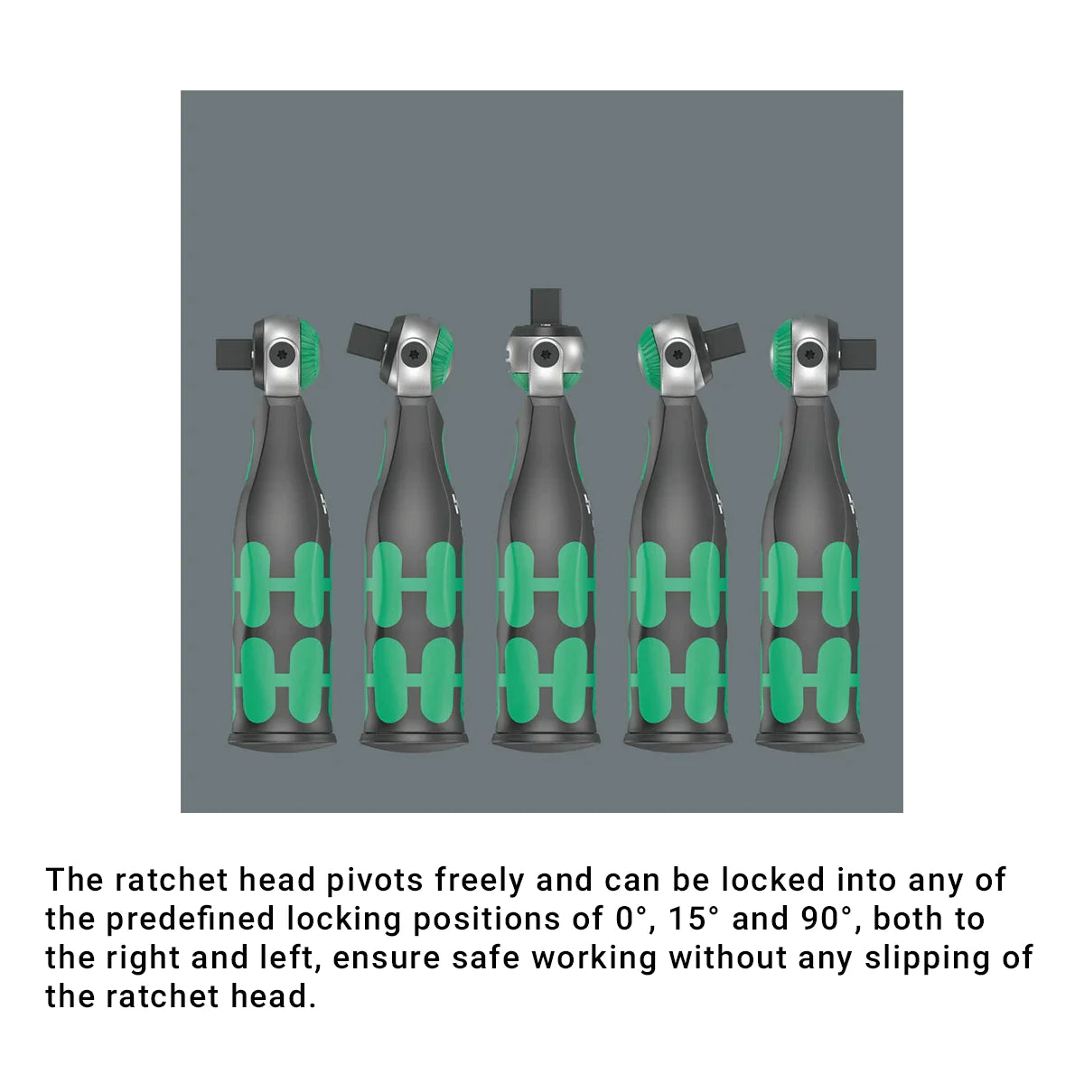 - Freely pivoting ratchet head with 5 predefined locking positions