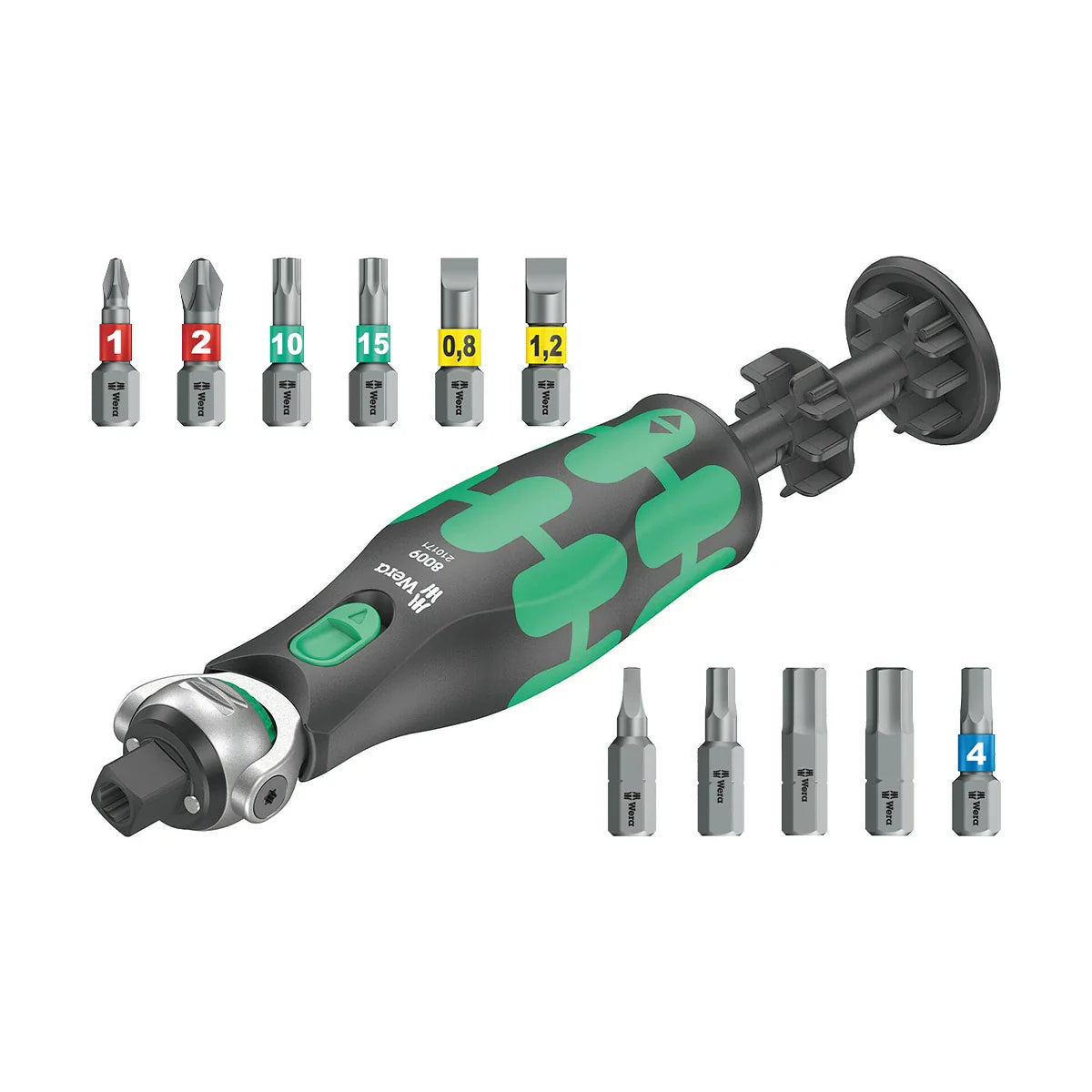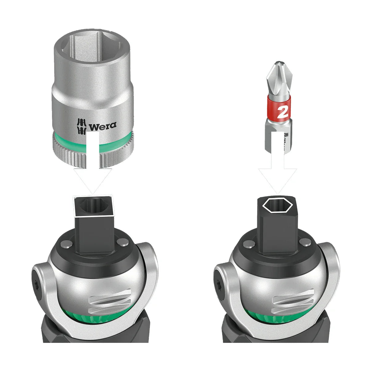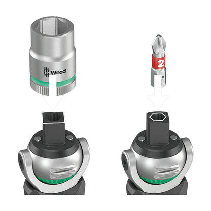 Comprehensive and space-saving ratchet/screwdriver combination. Compact Zyklop ratchet with bit magazine for the pocket. Magnetic direct mounting for ¼" bits and 3/8" sockets. Rapid tool change thanks to the non-locking mounting. As the head is lockable at 0°, 15° and 90°, the tool can be used as a ratchet and as a ratchet screwdriver. The fine toothing with 72 teeth allows for a low return angle of 5°. Wide range of applications thanks to 12 bits integrated in the handle. The robust ratchet mechanism allows for ample torque. Perfect combination of a Zyklop ratchet with a 12-piece screwdriver set. The 75 mm long universal holder for 1/4" bits can be used as an extension. Including sockets in the commonest dimensions. In a textile box, which can be docked onto the Wera 2go system.