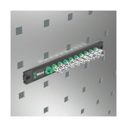 Socket rail with 9 manual and machine sockets (non-impact), 1/4". A smooth rotary mechanism allows a secure hold and easy access of the sockets. With Take it easy tool finder with colour coding by size - to help you find the required tool quickly and easily. The rail allows temporary attachment to metallic surfaces and, with its twist-to-unlock function, ensures secure locking and unlocking of the sockets.