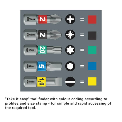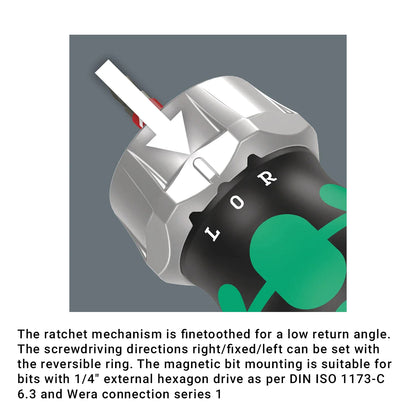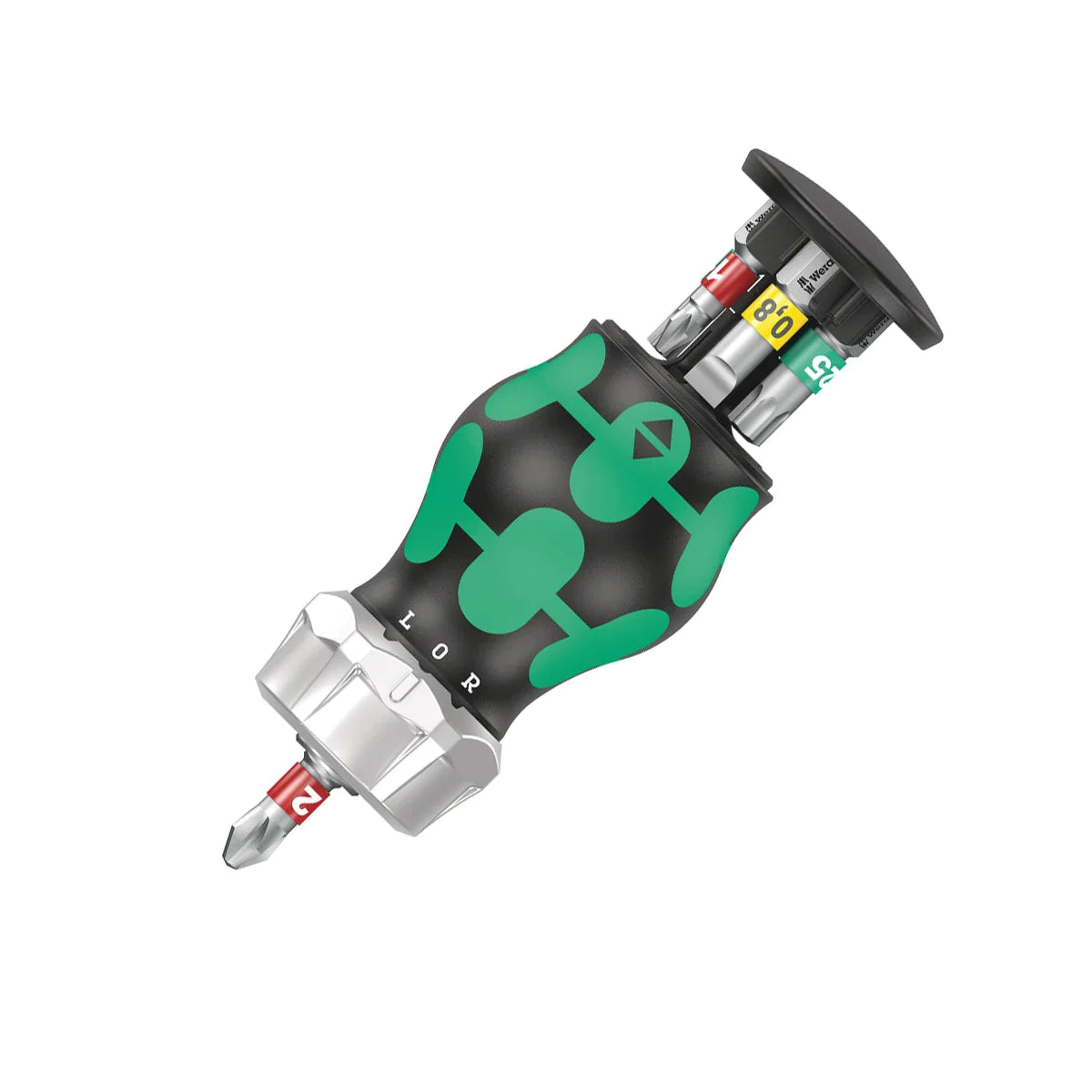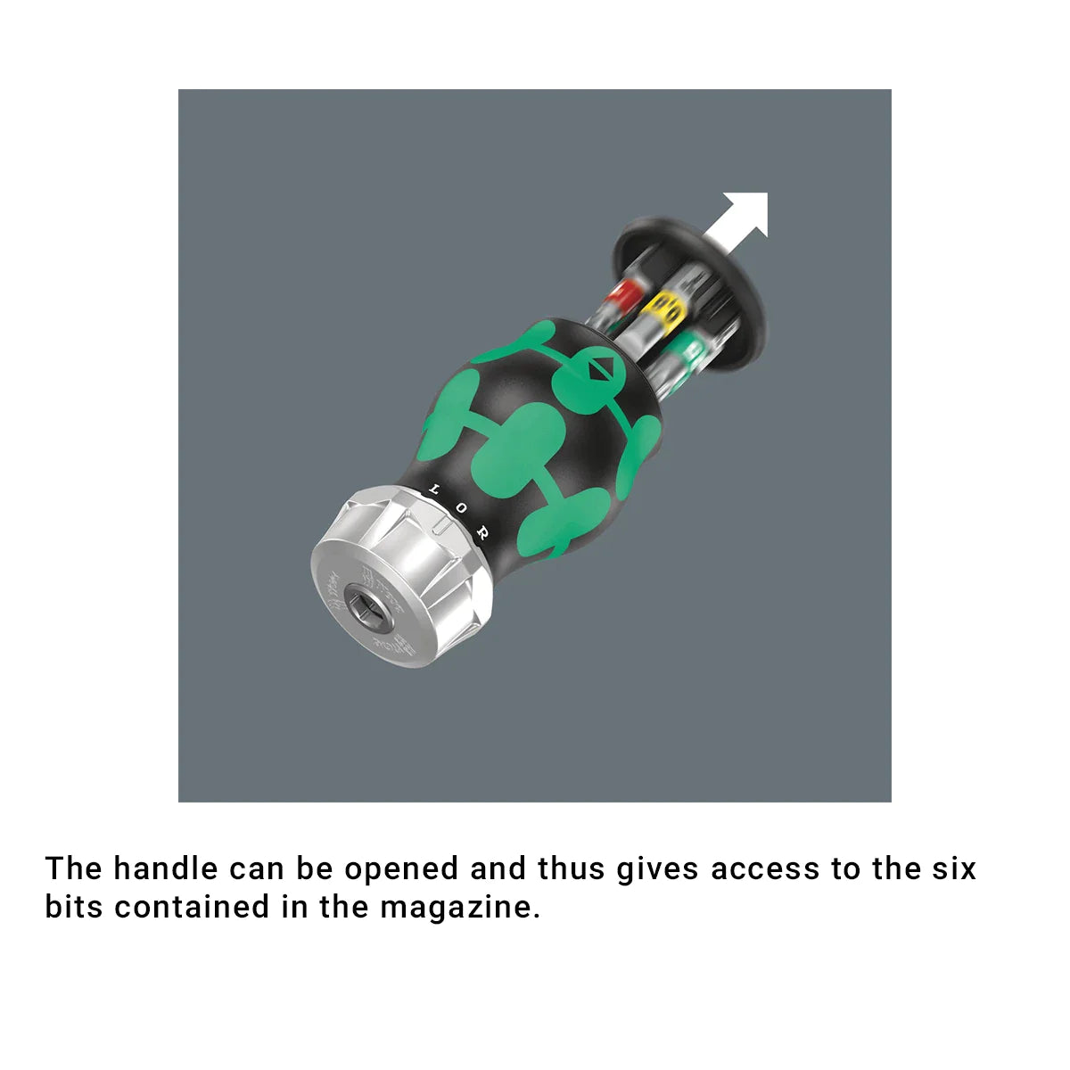 Particularly small bitholding screwdriver with extremely short bit mounting for hard to reach areas. With ratchet function and fine toothing for a low return angle. Easy-to-operate reversible ring (right, fixed, left). Includes 6 tough, universal bits, which are located in a magazine in the handle. The strong permanent magnet in the bit mounting ensures secure holding of the bit. The 2-component Kraftform handle with the practical combination of hard and soft zones allows for a firm grip and precise working. Take it easy tool finder: With size stamping and colour coding by output to help you find the required bit easily.