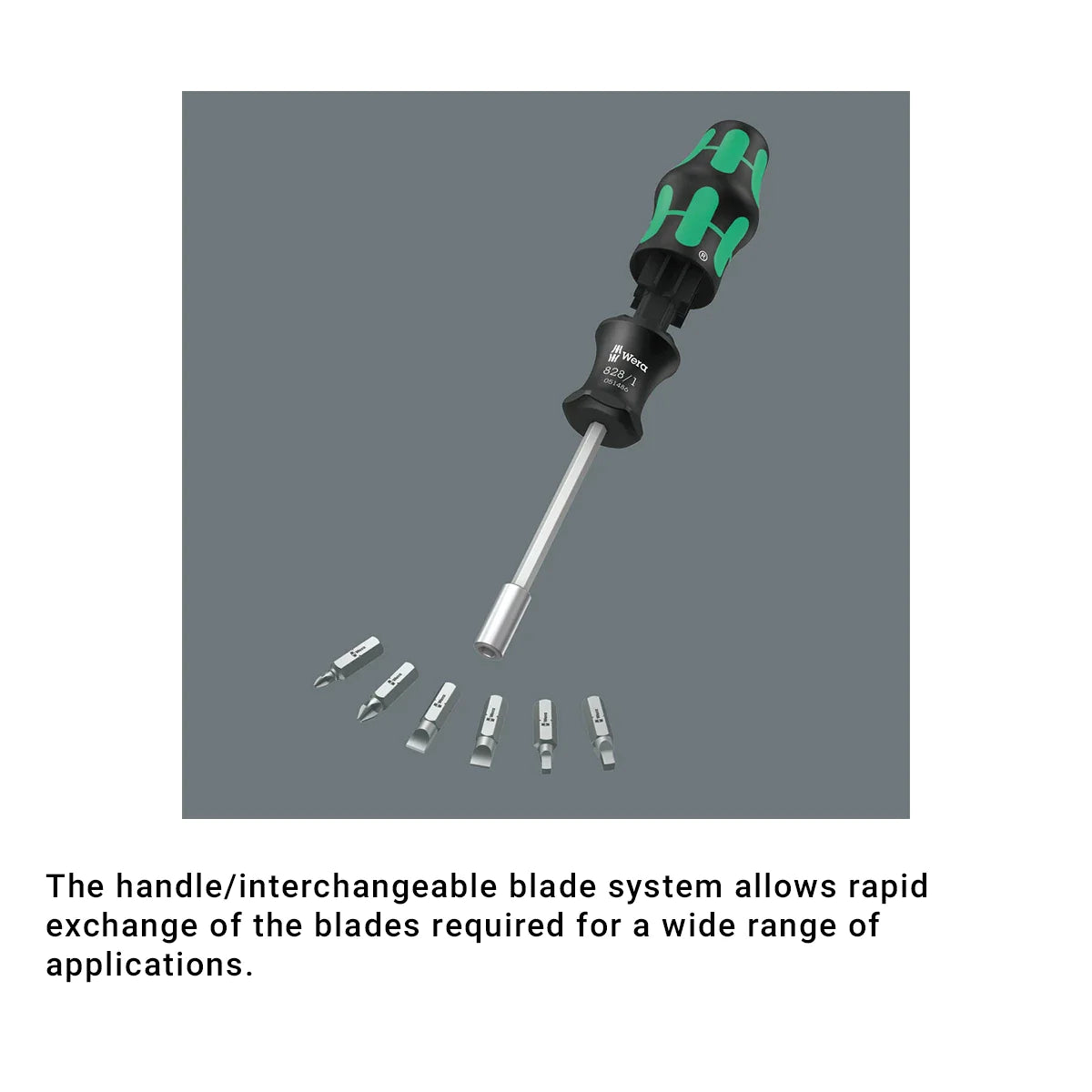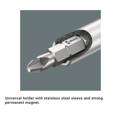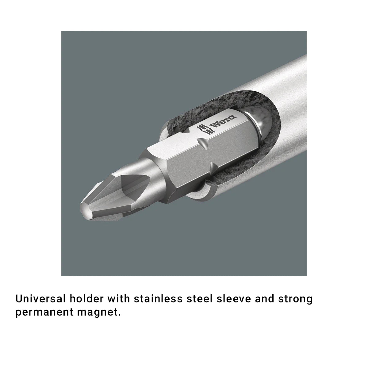 Wera compact tool with multi-component Kraftform handle for high working speeds and particularly ergonomic screwdriving. Bit magazine integrated in the handle, 6 tough bits for universal use. Bit holder with strong permanent magnet for secure seating of the bit.